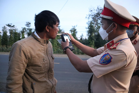 Cán bộ Đội CSGT Đường bộ số 2, Phòng CSGT (Công an tỉnh) kiểm tra nồng độ cồn người tham gia giao thông trên tuyến Quốc lộ 26. (Ảnh minh họa)