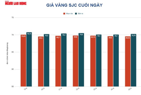 Trước đó, tuy giá vàng thế giới từ 9 giờ đến 17 giờ ngày 25-4 suy yếu nhưng giá vàng SJC biến động không đáng kể, chốt cuối ngày tại 70,25 triệu đồng/lượng.