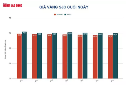 Trước đó, do giá vàng thế giới từ 9 giờ đến 17 giờ ngày 28-4 gần như bất động nên giá vàng SJC giảm 50.000 đồng/lượng, chốt cuối ngày tại 69,95 triệu đồng/lượng.