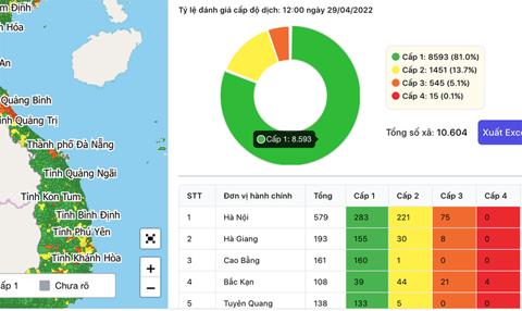 Thống kê cấp độ dịch đến chiều 29-4 của Bộ Y tế cho biết hiện có gần 95% xã phường toàn quốc là vùng xanh và vàng (nguy cơ dịch Covid-19 thấp và trung bình), trong đó số xã phường vùng xanh là 81%; vùng vàng là 13,7%; số xã, phường thuộc vùng đỏ (nguy cơ rất cao về dịch Covid-19) chỉ còn 0,1%.