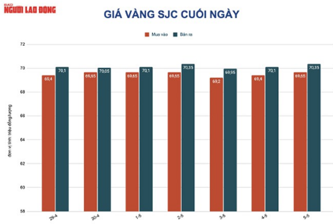 Trước đó, do giá vàng thế giới từ 9 giờ đến 17 giờ ngày 5-5 biến động không nhiều. Sức mua trong nước yếu nên trong khoảng thời gian này, giá vàng SJC gần như bất động tại mức 70,35 triệu đồng/lượng.