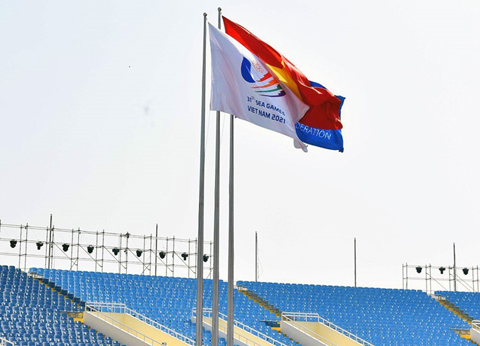Lá cờ SEA Games 31 và cờ Tổ quốc tung bay trên sân Mỹ Đình chuẩn bị cho Lễ khai mạc.