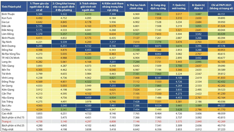 Dẫn đầu bảng tổng hợp kết quả PAPI 2021 của các tỉnh, thành phố là Thừa Thiên - Huế với 48,095 điểm; tiếp theo là Bình Dương với 47,178 điểm; Thanh Hóa với 47,102 điểm. Ba tỉnh gồm: Quảng Ninh, Bắc Giang, Bắc Ninh do dữ liệu bị nhiễu nên không đưa vào báo cáo đánh giá.