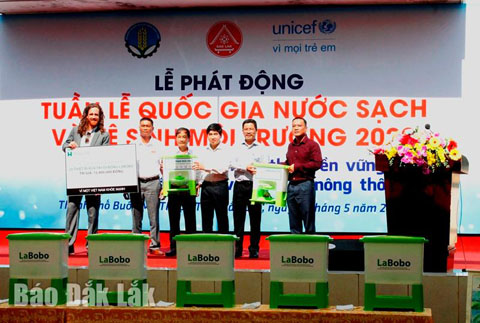 Tại lễ phát động, đại diện Công ty TNHH Happy Tap Việt Nam đã trao tặng bộ thiết bị rửa tay và xà phòng di động Labobo cho Trường Tiểu học Mạc Thị Bưởi và Trường THCS Ea Tu.
