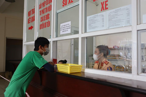 Người dân làm thủ tục cấp biển số xe tại Đội Đăng ký quản lý phương tiện thuộc Phòng CSGT, Công an tỉnh