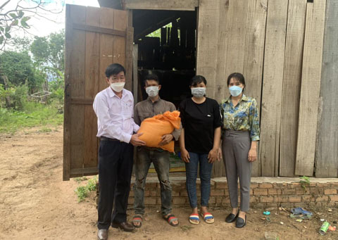 Đại diện cấp ủy, chính quyền xã Ea Lê tặng gạo hỗ trợ các gia đình có hoàn cảnh khó khăn
