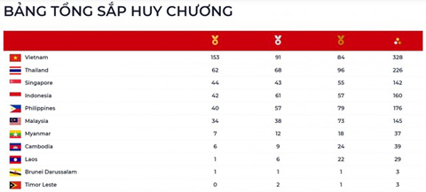 Tính đến 5h30 sáng ngày 20/5, Đoàn Thể thao Việt Nam đã vượt mốc 150 HCV trong khi Singapore và Indonesia đều có sự thăng tiến đáng chú ý.