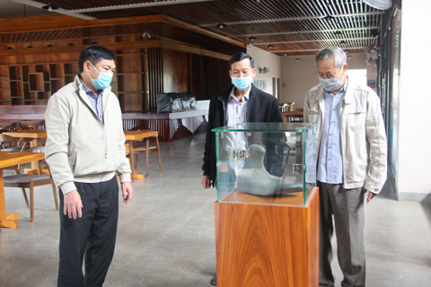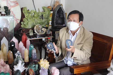 Ông Lê Đình Hiền (bìa phải) là chủ nhân viên đá màu xanh nước biển có hình bàn chân quý hiếm.