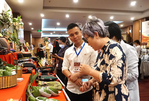 Các đại biểu tham quan gian hàng trưng bày các sản phẩm đặc trưng của TP. Buôn Ma Thuột tại hội thảo.