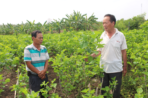 Ông Dẩu (bên phải) chia sẻ kinh nghiệm trồng dâu nuôi tằm với người dân địa phương.