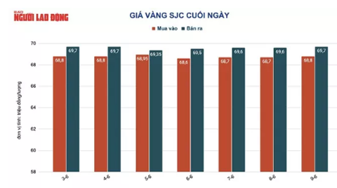 Trước đó, do giá vàng thề giới từ 9 giờ đến 17 giờ ngày 9-6 gần như bất động, cộng với nhưng do sức mua yếu nên trong khoảng thời gian này, giá vàng SJC "giậm chân tại chỗ" 69,7 triệu đồng/lượng.