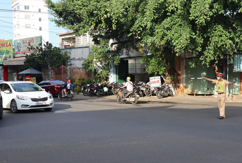 Cán bộ Đội Cảnh sát giao thông - Trật tự (Công an TP. Buôn Ma Thuột) hướng dẫn, điều tiết giao thông khu vực Trường Tiểu học Nguyễn Bỉnh Khiêm. (Ảnh minh họa)