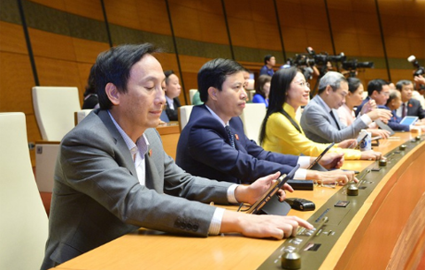 Các đại biểu Quốc hội bấm nút thông qua Nghị quyết kỳ họp thứ 3 - Ảnh: Quochoi.vn