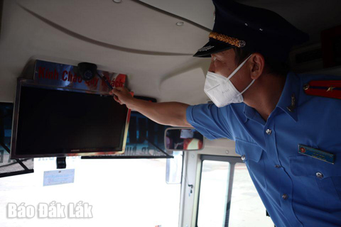 Cán bộ Thanh tra Sở Giao thông vận tải Đắk Lắk kiểm tra việc thực hiện lắp camera trên xe ô tô khách tại Bên xe liên tỉnh
