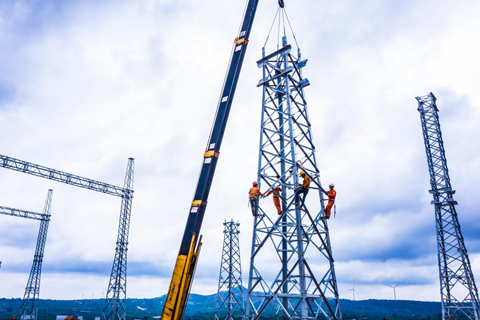 Công nhân thi công đường dây Dự án điện gió Ea Nam tại huyện Ea H'leo.