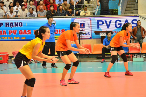 Nguyễn Thị Phước, H'Mia Êban, Phạm Thị Lan (từ trái sang phải) nỗ lực thi đấu cho đội bóng chuyền Đắk Lắk.