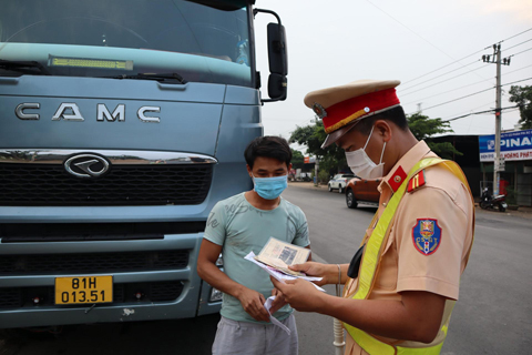 Cán bộ Phòng Cảnh sát giao thông (Công an tỉnh) kiểm tra giấy tờ người điều khiển phương tiện