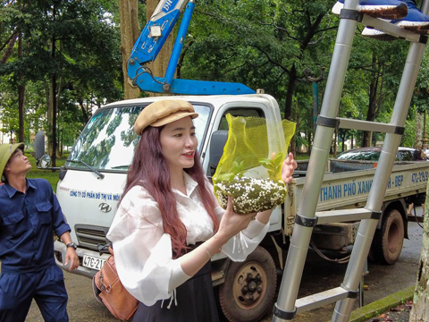 Ghép cành lan đầu tiên lên cây xanh trong khuôn viên.