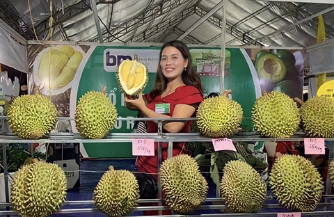 Chị Nguyễn Thị Thanh Thảo giới thiệu sản phẩm sầu riêng đạt tiêu chuẩn VietGAP tại Hội chợ nông sản huyện Krông Pắc lần thứ I.