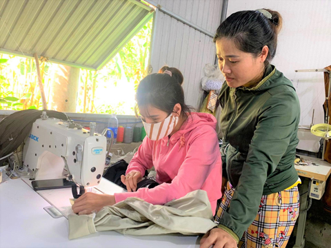Nhân công làm việc tại cơ sở may của chị Võ Thị Lợi (buôn Roang Đơng, xã Ea Hiu)