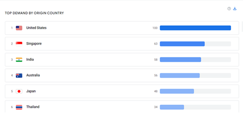 Tốp 10 quốc gia tìm kiếm nhiều nhất về du lịch Việt Nam lần lượt là: Mỹ, Singapore, Ấn Độ, Úc, Nhật Bản, Thái Lan, Đức, Pháp, Anh, Malaysia.