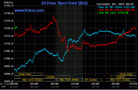 Giá vàng thế giới đang có những biến động mạnh trong ngày 7/9 và 8/9 (Nguồn: Kitco).