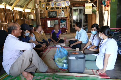 Chính quyền địa phương và cán bộ Trạm Y tế xã Yang Reh (huyện Krông Bông) tuyên truyền, vận động người dân đi tiêm vắc xin phòng COVID-19. Ảnh: Đình Thi