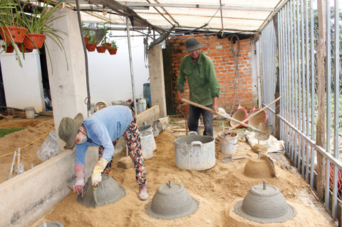 Tương tự, những ngày này vợ chồng ông Nguyễn Kiên (ở thôn 7) cũng đang bận rộn chuẩn bị cho vụ cúc Tết Quý Mão 2023. Dự kiến đến cuối tháng 8 (âm lịch) gia đình ông sẽ hoàn thành việc xuống giống hoa. Với thâm niên trồng cúc trên 10 năm nên các khâu, các công đoạn trồng cúc đều được vợ chồng ông thực hiện một cách thuần thục, từ khâu quay chậu, chuẩn bị đất, xuống giống, chăm sóc hoa… Đặc biệt, 4 năm gần đây, gia đình ông Kiên còn tự ươm giống để trồng và xuất bán cho những hộ lân cận. Vụ Tết sắp tới, gia đình ông dự tính trồng 1.400 chậu cúc pha lê.