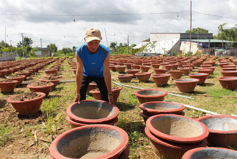 Anh Nguyễn Hoài Phương (thôn 5, xã Tân Hoà) chuẩn bị chậu xuống giống hoa vụ Tết