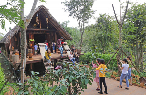 Du khách chụp ảnh lưu niệm tại nhà dài - một trong những nét văn hóa độc đáo của dân tộc Êđê ở Đắk Lắk. Ảnh: Hoàng Gia