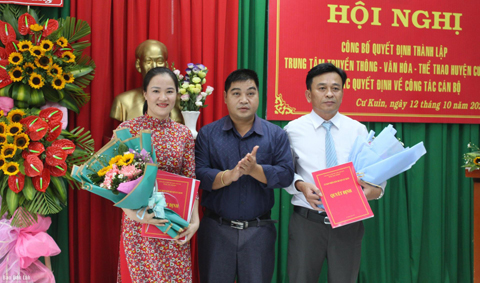 Tại buổi lễ, Phó Chủ tịch UBND huyện Y Ngơn Niê đã trao Quyết định thành lập Trung tâm Truyền thông – Văn hóa – Thể thao huyện và các Quyết định bổ nhiệm các chức vụ Giám đốc, Phó Giám đốc Trung tâm, có hiệu lực từ ngày 12/10/2022. Ông Phạm Trung Công, nguyên Trưởng Đài Truyền thanh huyện được bổ nhiệm làm Giám đốc Trung tâm Truyền thông – Văn hóa – Thể thao huyện.
