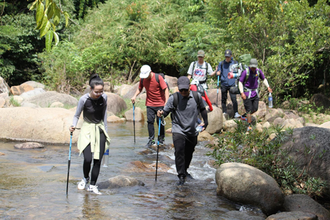 Du khách trên hành trình chinh phục đỉnh núi Chư Yang Lắk.