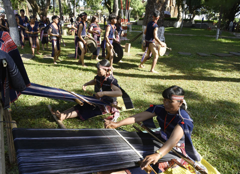 Phụ nữ dân tộc Bhanar trình diễn nghề dệt thổ cẩm