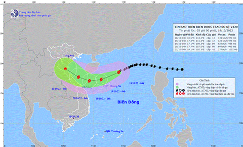 Diễn biến bão số 6: Lúc 4h ngày 18/10, vị trí tâm bão số 6 ở vào khoảng 18,5 độ Vĩ Bắc; 114,2 độ Kinh Đông, cách Hoàng Sa khoảng 350 km về phía Đông Bắc. Sức gió mạnh nhất vùng gần tâm bão mạnh cấp 12 - 13 (118 - 149 km/giờ), giật cấp 15, di chuyển theo hướng Tây Tây Nam với tốc độ khoảng 15 km/giờ.