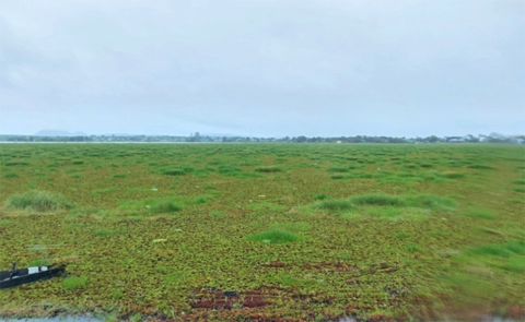Các hồ đập tại Đắk Lắk bị bèo phủ kín mặt nước, nguy cơ mất an toàn cao. Ảnh: Quang Yên