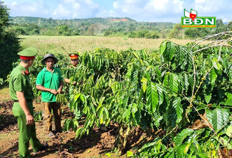 Công an xã Trường Xuân (Đắk Song) điều tra, xác minh số cây cà phê của gia đình ông Y Kem ở thôn 3, xã Trường Xuân bị hái trộm
