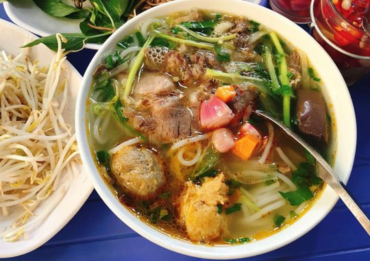 Ở hầu hết các thành phố khác trên cả nước, bún được dùng trong món ăn này thường có sợi to. Nhưng tại Huế, bạn có thể thưởng thức các phiên bản bún khác nhau: sợi to và có nơi bán cả sợi bún nhỏ. Một bát bún đầy đủ thường bao gồm giò heo ninh nhừ béo ngậy, một - hai miếng tiết to, giò bò, thịt bò luộc thái mỏng. Giá mỗi bát từ 20.000 đồng (tại chợ Đông Ba) đến 50.000 đồng (tại các hàng quán).Bún bò ăn kèm rau sống, giá đỗ. Nếu thích ăn rau chín, bạn có thể yêu cầu chủ quán trần rau sống giúp trước.