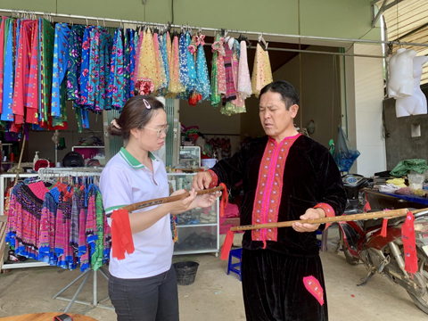 Nghệ nhân Giàng A Sánh giới thiệu về cây gậy sênh tiền. Ảnh: T. Linh