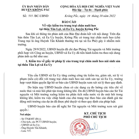 Sau khi báo đăng, UBND huyện Krông Pắc đã chỉ đạo Phòng Tài nguyên và Môi trường phối hợp với Công an kinh tế huyện, UBND xã Ea Uy tiến hành kiểm tra thực tế hiện trường. Qua kiểm tra cho thấy: chủ trang trại có đầy đủ giấy tờ pháp lý của trang trại chăn nuôi heo nái sinh sản tại thôn Tân Lợi, xã Ea Uy như: Quyết định về việc phê duyệt báo cáo đánh giá tác động môi trường của dự án "trang trại chăn nuôi heo nái sinh sản tại xã Ea Uy"; Quyết định về việc bổ sung Quy hoạch phát triển kinh tế trang trại huyện Krông Pắc, tỉnh Đắk Lắk đến năm 2020; Giấy phép khai thác, sử dụng nước dưới đất.