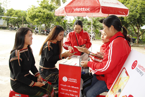 Nhân viên Viettel Đắk Lắk hỗ trợ người dân xã Tân Tiến sử dụng các tiện ích thanh toán không tiền mặt.