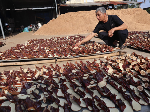 Ông Đào Ngọc Toản (thị trấn Buôn Trấp, huyện Krông Ana) phơi nấm linh chi sau thu hoạch