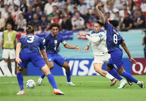 Pha tranh bóng quyết liệt giữa tiền vệ Anh Jack Grealish (thứ 2, phải) với các tuyển thủ Mỹ. (Ảnh: THX/TTXVN).