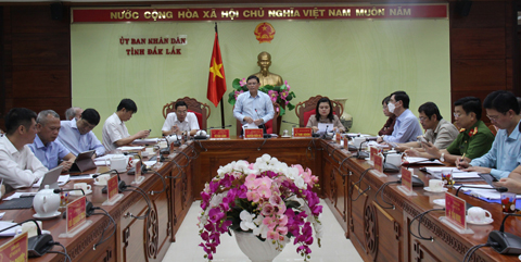 Phó Chủ tịch Thường trực UBND tỉnh Nguyễn Tuấn Hà và các Phó Chủ tịch UBND tỉnh H’Yim Kđoh, Võ Văn Cảnh điều hành phiên họp.