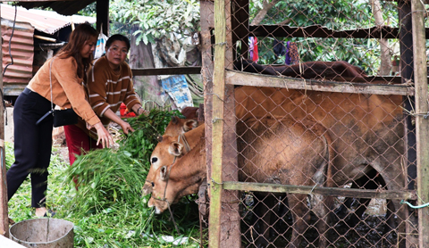 Chị H’Mnônh Ayũn (bên trái), buôn Ea Đun chăm sóc đàn bò của gia đình.