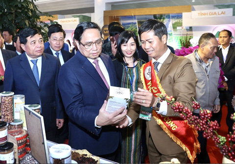 Thủ tướng Chính phủ Phạm Minh Chính tham quan gian hàng trưng bày sản phẩm cà phê hữu cơ của Công ty TNHH Sản xuất và Thương mại Vương Thành Công. Ảnh: Nhân vật cung cấp