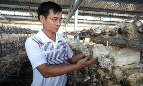 Doanh nhân Đoàn Xuân Trường kiểm tra xưởng nấm của mình tại thôn 6, xã Hòa Khánh, TP. Buôn Ma Thuột