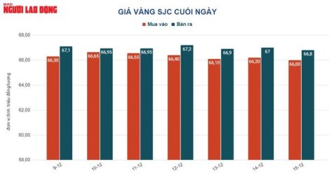 Trước đó, trong ngày 15-12, do giá vàng thế giới đi xuống nên giá vàng SJC giảm 100.000 đồng/lượng, chốt cuối ngày tại 66,8 triệu đồng/lượng.
