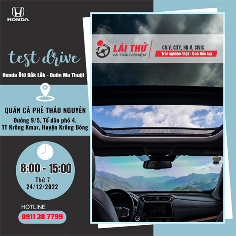 Ngày 24/12/2022, Honda Ôtô Đắk Lắk – Buôn Ma Thuột tổ chức chương trình “Lái thử các dòng xe Honda Ôtô” tại Quán CÀ PHÊ THẢO NGUYÊN, Đường 9/5, Tổ dân phố 4, TT Krông Kmar, Huyện Krông Bông, Tỉnh Đắk Lắk