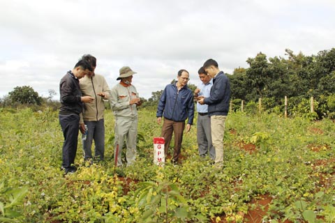 Đại diện các đơn vị kiểm tra và bàn giao mốc Dự án đường cao tốc Khánh Hòa - Buôn Ma Thuột tại xã Ea Knuếc.