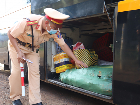 Cán bộ Phòng CSGT, Công an tỉnh kiểm tra hàng hóa trên xe khách